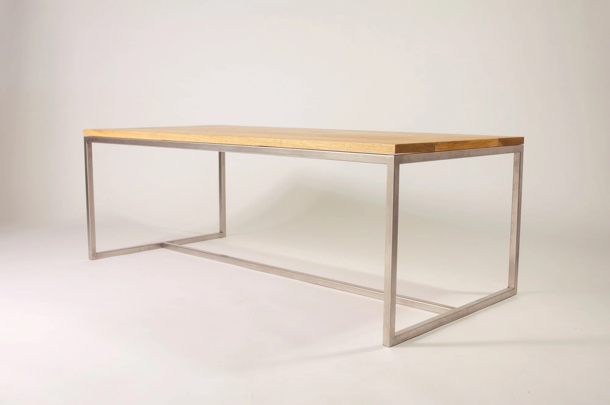 Made in locally + sustainably‐sourced solid pignut hickory with a tung oil finish and a stainless steel square tube base, this coffee table was designed to be straightforward, practical and to fit well in a variety of settings. Its cool and attenuated base complemented by the warmth and grain character of its top, this piece is characterized by its quiet presence.